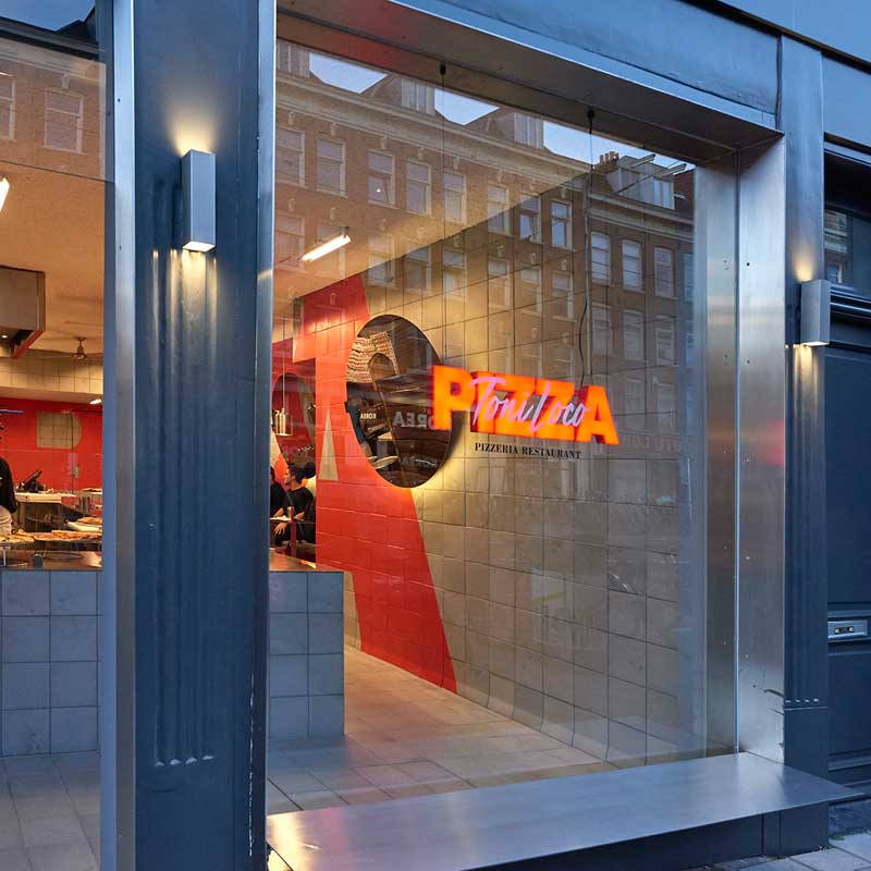 Toni Loco’s interior is utilitarian with a touch of sophistication. Interior architect, Pieter Kool, realized the brand identity, with a single gesture in material and colour palette. A ‘one size’ concrete tile grid system wrap the floor and walls. Much like the purist approach to their pizzas, the interior is minimalistic with careful attention to detail. The raw yet refined interior is finished with round mirrors to draw attention to the heart of the space – the kitchen.